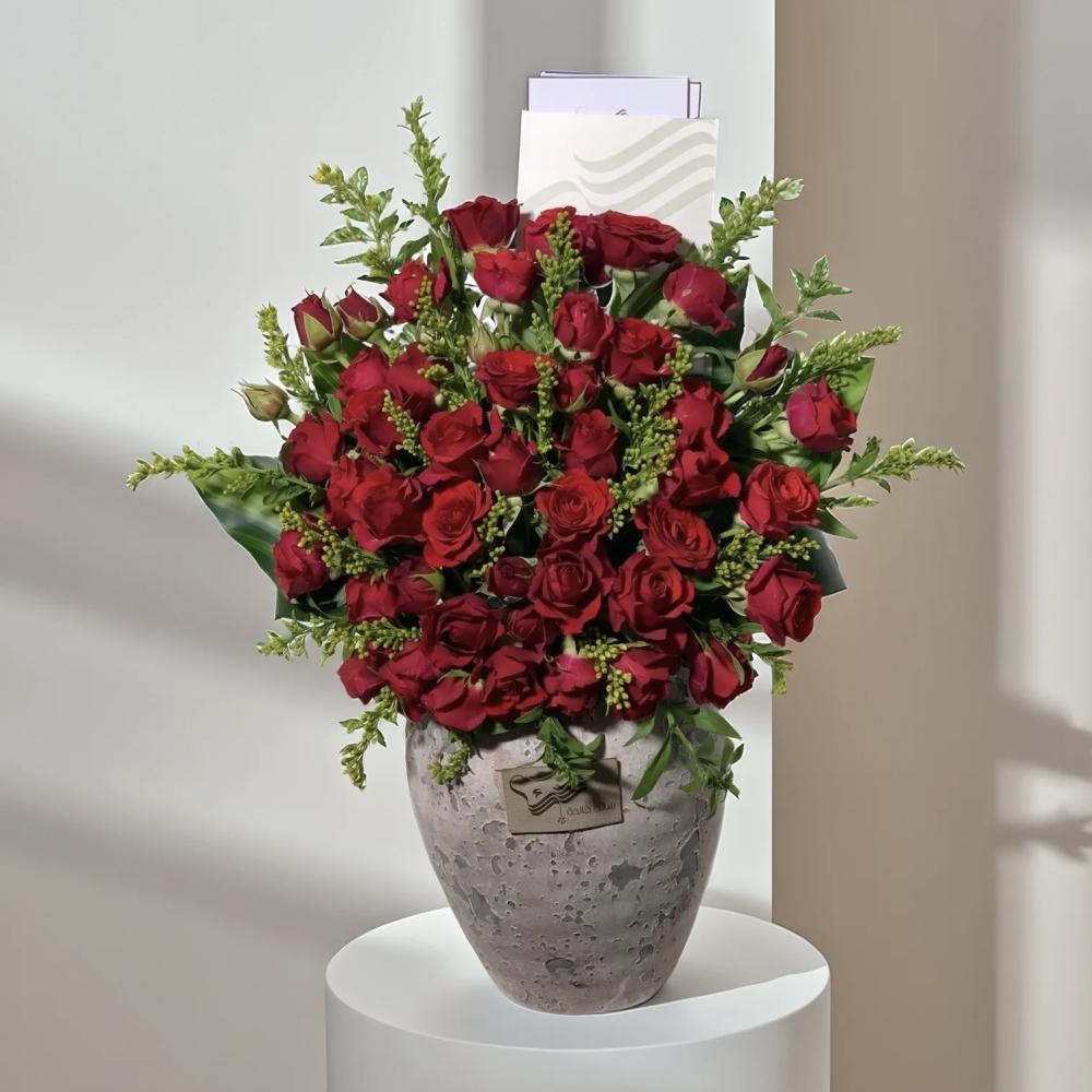 فازة فاخرة بتفاصيل دقيقة ونقوش مميزة تضيف طابعًا راقٍ لكل ركن توضع فيه.. تحتضن تنسيقًا آسرًا من البيبي جوري الأحمر الطبيعي، يتناغم مع الأغصان الخضراء المنعشة في مشهد يُجسّد الجمال الكلاسيكي بنفحة أنيقة من الطبيعة، قطعة تنبض بالرقي، وتُعبر عن الذوق الهادئ والعاطفة العميقة.